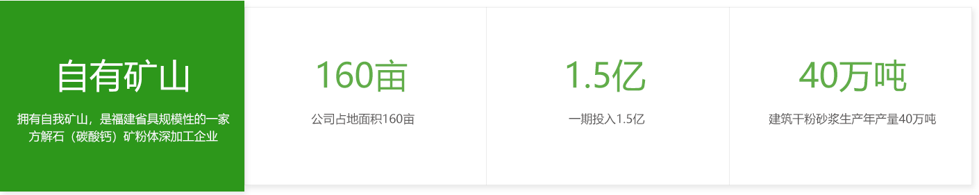 以生產特種干粉砂漿及重質碳酸鈣深加工為主,近年不斷整合優化行業供應鏈,研發生產墻地面干粉砂漿與建筑飾面材料一體化材料,日益精進;目前年產量40萬噸,位居福建省行業生產規模前列。